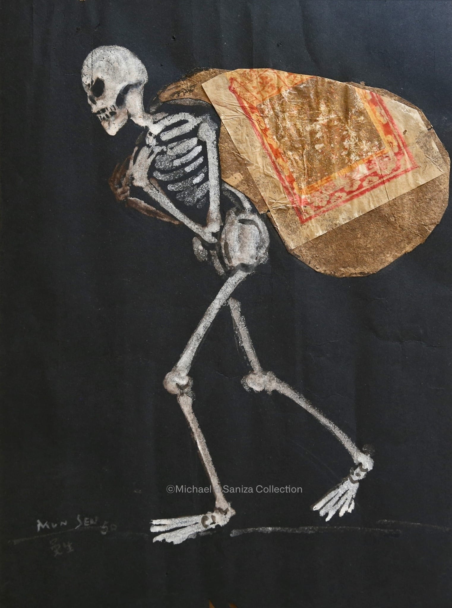 Today, the influence of this "Father of Malaysian Art" remains pervasive. Like the tangled rainforest vines in his paintings, his artistic legacy has permeated the very fabric of Nanyang culture: from the scholar-literati heritage revealed in early ink works like Orchid (Figure 10), to the fieldwork documenting Nanyang villages through scenes like the luxuriant forest the villagers lived in, as well as the fishing nets and kelong they use on a daily basis (Figures 11–13) during his prime, and to the existential inquiries in late-career pieces such as Death Pursuit of Wealth (Figure 14), his palette remained perpetually steeped in the salt of Nanyang, offering invaluable clues for understanding this region’s cultural landscape.