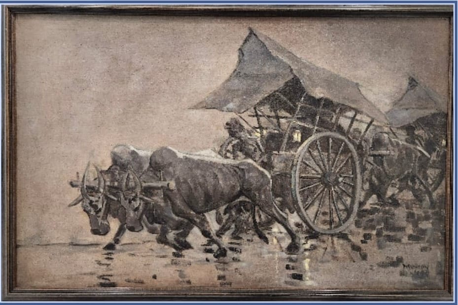 Yong Mun Sen’s work End of the Day (Figure 7) captured this era’s anguish through a dim, desaturated palette and heavy, oppressive themes, rendering with visceral clarity the burdens borne by civilians. This painting stands as a haunting time capsule of wartime existence.